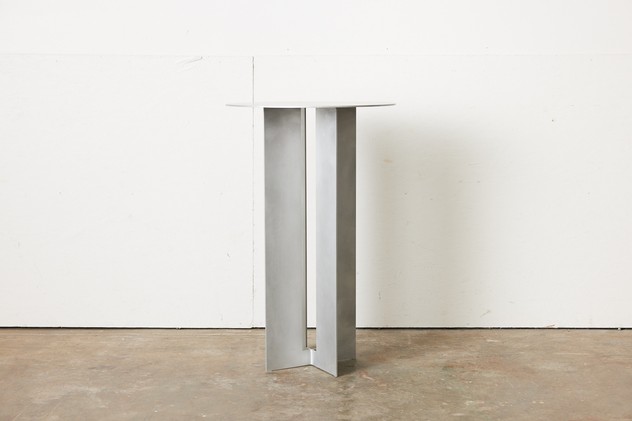 The Mers Cafe Table is fabricated from solid aluminum and is suitable for use indoors and out. Form is inspired by the simple utilitarianism of West Coast aluminum fishing boats.